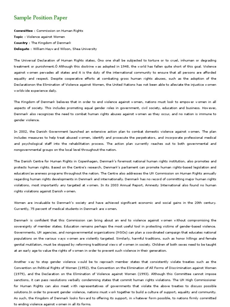 The death penalty is unjust because of the inhumane and cruel methods of execution A position paper example, in this case, will help you learn more about the contents of each section. The text sounds logical, and the writer uses arguments to persuade the readers in his point. The position papers submitted here are formal, public statements of a delegation's position on the topics under consideration in a particular committee. Position paper instructions example #1: